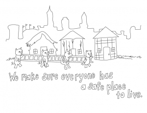 From Rose: “I drew these to help kids keep busy at meetings, and also to help kids learn what we work on at DSA. The three little pigs are important here, because here in Cleveland we’re working on housing justice. Almost 20 percent of children in Cleveland have diagnosed high blood lead levels, putting them at risk for impaired cognitive development and kidney disease.