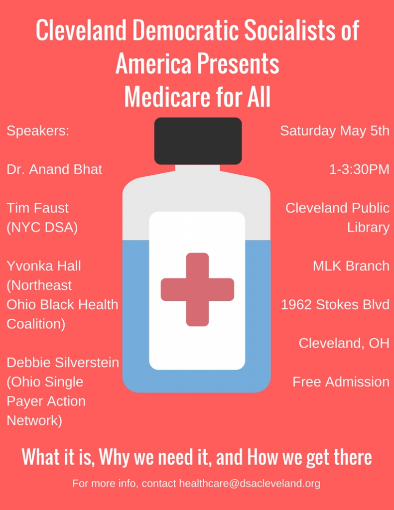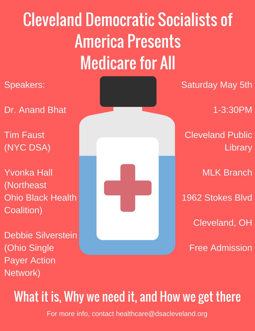 Cleveland Democratic Socialists of America presents Medicare for All: What it is, why we need it, and how we get there. Come learn about how our current for-profit healthcare system affects the lives of Ohioans and what we can do to make it better.