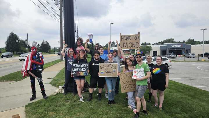 This weekend Starbucks workers went on strike in Cleveland, part of a week of 150+ stores protesting the removal of Pride flags from shops nationwide. Partners struck at the newly unionized Strongsville location and in Crocker Park. With the Summer weather, turnout at both stores was excellent. For the first time in a while, stores failed to open altogether, with management apparently not mustering enough scabs to make the attempt. Overworked baristas and their allies celebrated their victory, playing music, chanting into our many megaphones, fanning ourselves with cardboard signs, chatting with supporters. A resident from the Crocker apartments brought several boxes of popsicles (and a dog!) to the picket line. Spirits were high as the baristas turned away a full-day’s business during a major holiday weekend.